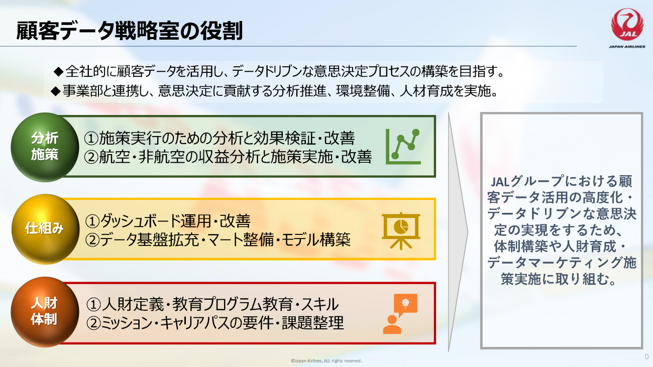 しかし、コロナ禍で沈んでしまった事業を再起させるには、航空系と非航空系の垣根を越えた組織横断的な顧客データ分析を行う環境の整備が急務であった。そこで、約4000万人のJALマイレージバンク(JMB)会員およびJALカード会員のデータを共通基盤に統合し、専門組織としてその運用を行う体制としてできたのが顧客データ戦略室である。
