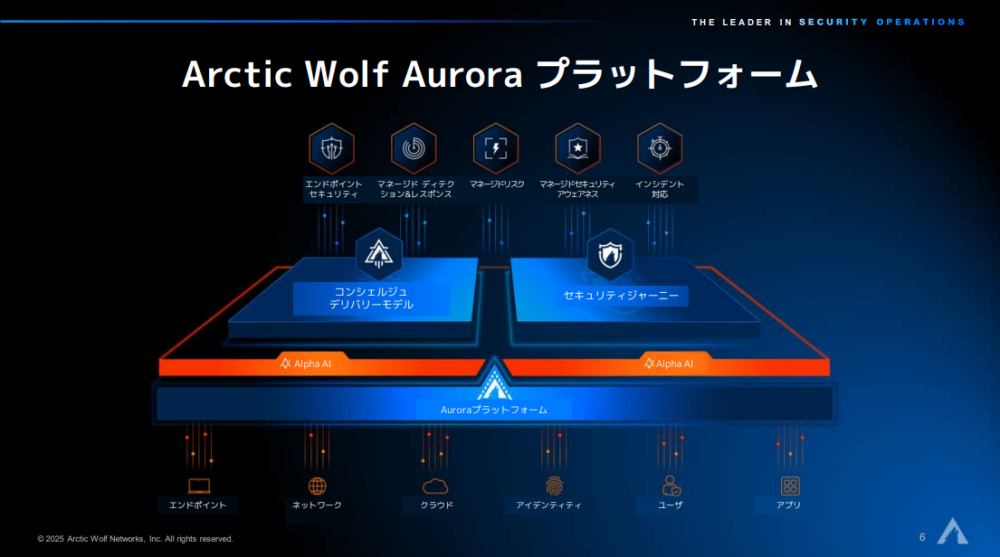 同社のサービスの中核となるのが、「Arctic Wolf Aurora」プラットフォームだ。エンドポイントからネットワーク、クラウド、アイデンティティ(ID)、ユーザー、アプリに至るまでのエンティティから、1週間あたり9兆以上のイベントを収集しているという。収集したイベントは、プラットフォームに統合されている独自開発のAI「Alpha AI」によって分析され、リアルタイムでの脅威検知に活かされる仕組みになっている。