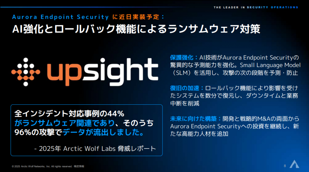なお、UpSightの優位性はロールバック機能だけでなく、そのAI技術にあると日本法人社長の吉本努氏は語る。UpSightのAIはSLM(小規模言語モデル)となっており、昨今のトレンドであるLLM(大規模言語モデル)と比べて軽量なうえ、より高速な処理が可能だ。数秒を争うリアルタイム処理が必要な防御の場面に適している。