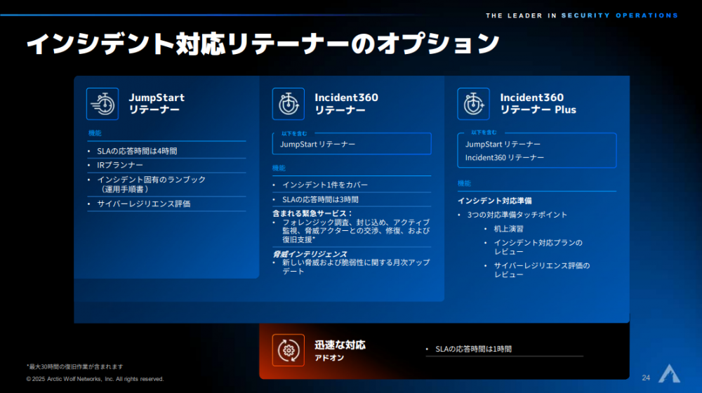 「JumpStart リテーナー」と「Incident 360 リテーナー」は、あらかじめSLA(サービス品質保証)の応答時間を必要に応じて購入しておき、インシデント発生時にはそこから時間分・契約分の対応をサポートしてもらえるプランだ。ただし後者のオプションでは、インシデントの種類を問わず1件まるまる対応が完了するまでカバーされる。
