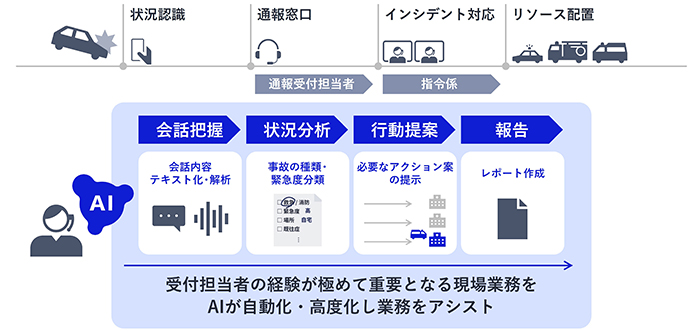 - 状況把握から行動決定支援までの業務の自動化:指令室への緊急通報の会話内容をリアルタイムで解析し、抽出した重要な情報から状況分析と次にとるべきアクションを提案することで、オペレーターの把握負荷を軽減。これにより、オペレーターは従来よりも多くの情報に基づいた対応が可能になる