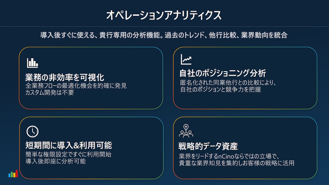 nCinoプラットフォームを使い始めると、マニュアルタスク中心のプロセスから、デジタルで共同作業を行う職場への移行が始まる。それだけでも効率化は可能だが、Operation Analyticsを通して、より広範なデータにアクセスできるとわかると、自行だけでは気づくことの難しかった新しい機会を発見できる。効率化によるコスト低減の機会もあれば、収益増加の機会も得られる。デズモンド氏は「ビジネス機会の金脈は、普段の業務の中にあることを理解してほしい」と語り、Operation Analyticsがその糸口となるインテリジェンスを提供すると説明した。