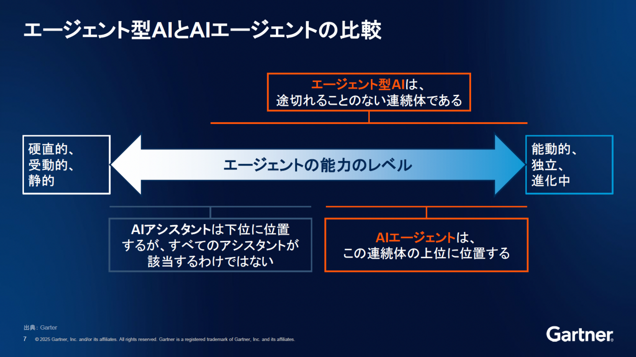 2025年5月、ガートナーは「AIエージェント(AI Agent)」と「エージェント型AI(Agentic AI)」の相違について公式見解を発表した。その見解によれば、エージェント型AIはAIエージェントよりも包括的な概念であり、これからも能力の進化を続けていくスペクトラムと捉えられている。Gartnerのキャメロン・ハイト氏は「I&Oにおけるエージェント型AIの新たなユースケース」と題した講演中、エージェント型AIはスペクトラムの上位に位置し、「AIソリューションの開発手法で、2つ以上のAI機能を実装したソフトウェアを利用しているものが該当する」と解説した。
