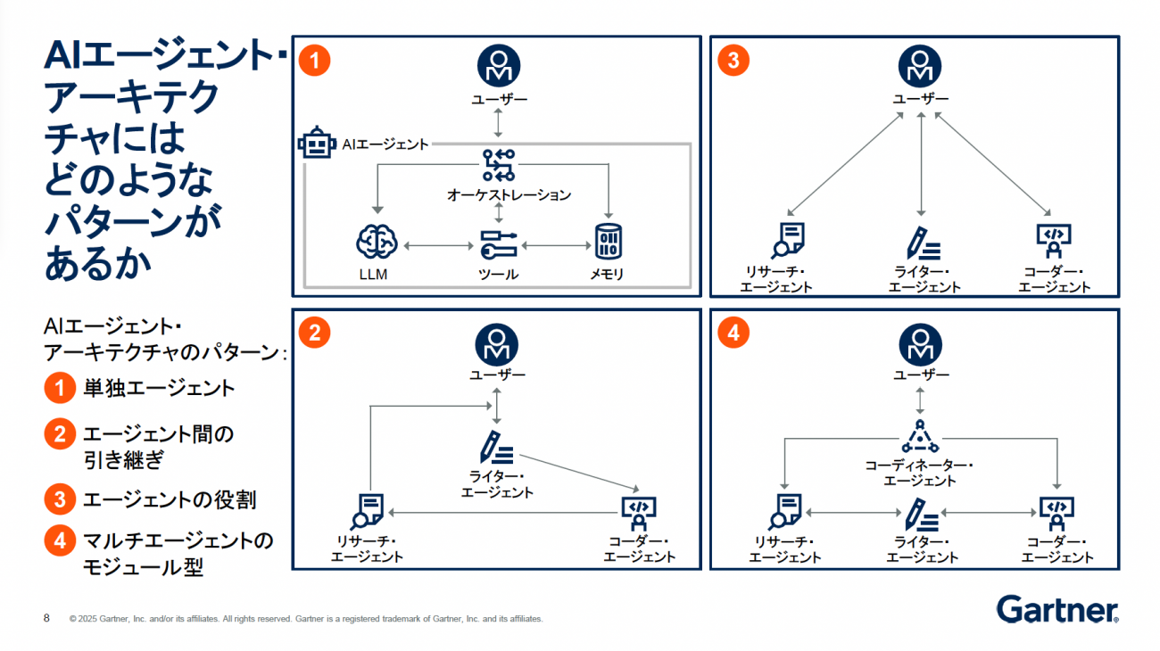 実際のところ、ベンダーが提供するソリューションの中には、エージェント型AIに似てはいるものの、実際にはAI機能が実装されていないものもある。ユーザー企業がテクノロジーを採用するときには、真のエージェント型AIか否かを見極めていくことが必要になると指摘した。