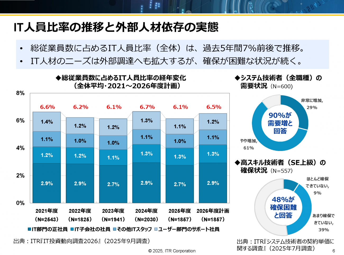 ITRが実施した投資動向調査によれば、IT部門を取り巻くリソースの状況は依然として硬直化したままである。総従業員数に占めるIT人員比率は、過去5年以上にわたって7%前後で推移しており、DXが叫ばれる昨今においても大幅に拡充される傾向は見られない。正社員比率に限れば2.7~2.9%程度であり、人員不足は慢性的な課題だ。外部人材に目を向けても、90%の企業でシステム技術者の需要が増加しているのに対し、高度なスキルを持つ上級SEを「確保できていない」と回答した企業は48%に達している。