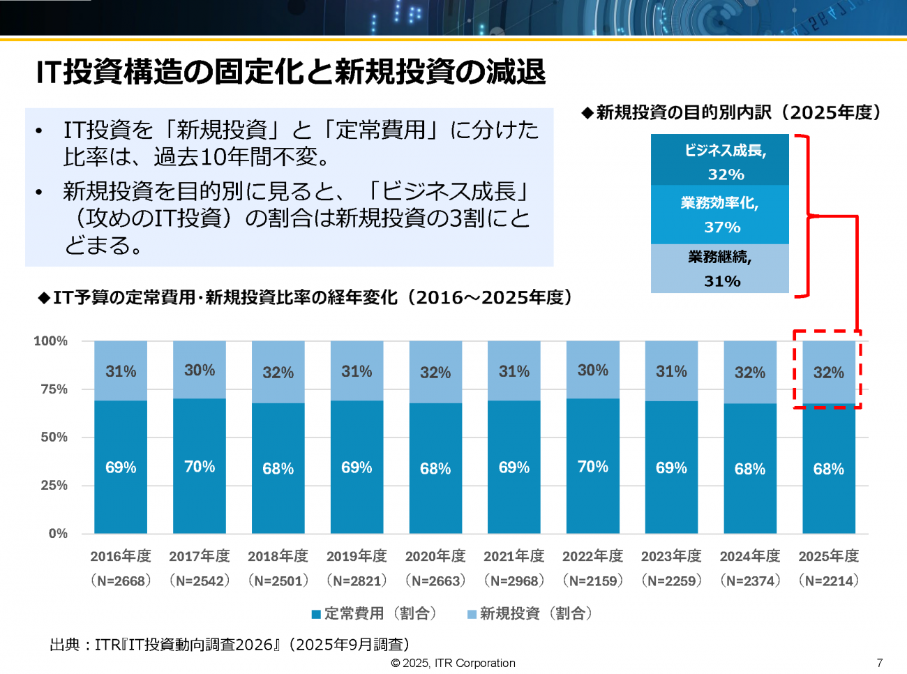 予算面においても、深刻な“固定化”が立ちはだかっている。IT予算全体を「定常費用(維持管理)」と「新規投資」に分けた比率は、過去10年間ほぼ不変のまま。2025年度のデータでも定常費用が68%を占め、新規投資に回せる予算は32%に過ぎない。さらに新規投資の内訳を精査すると、「ビジネス成長(攻めのIT)」に向けられた割合は32%に留まり、多くが「業務効率化」や「業務継続」という守りの領域に費やされていることが分かる。