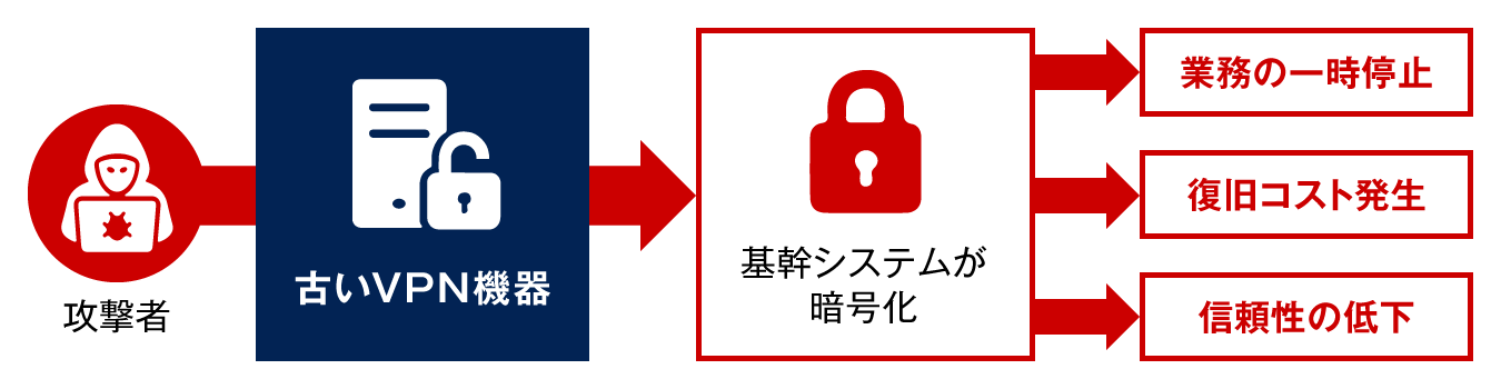 サポート切れのOSやミドルウェアの放置は、サイバー攻撃の格好の標的となります。たとえば、古いデバイスやプログラムの脆弱性を突かれ、ランサムウェアに感染し、基幹システムが暗号化され、数週間の業務停止と多額の復旧費用、信頼失墜という被害を受けるといったインシデント事例が増えています。