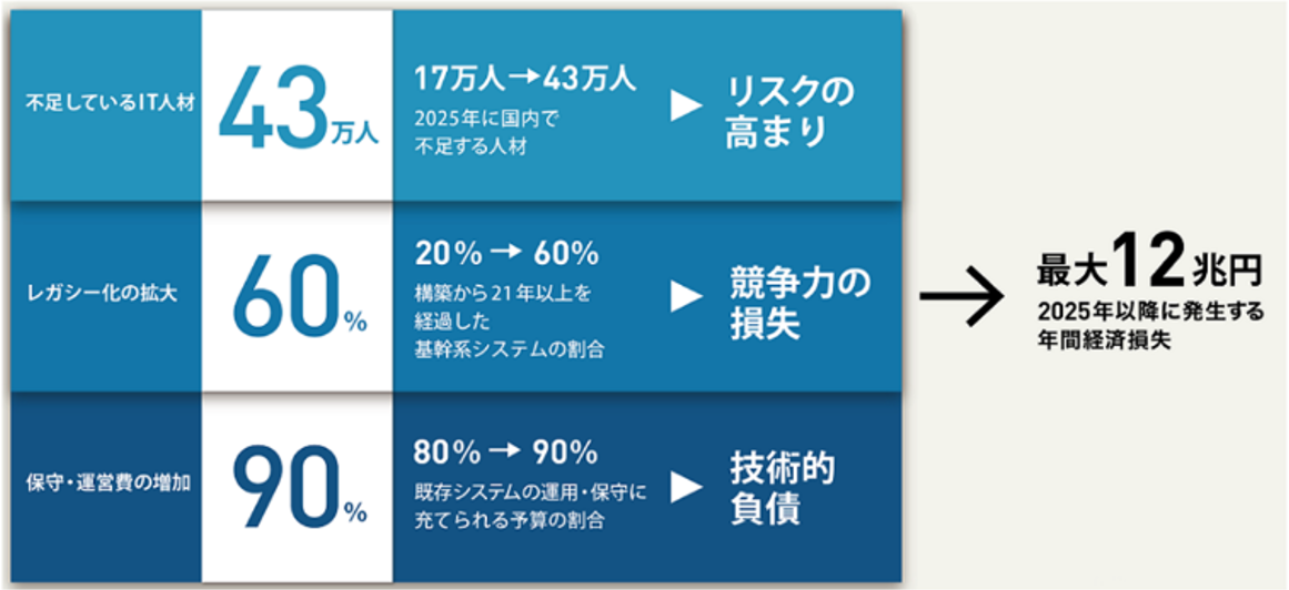 経済産業省が「2025年の崖」を提唱して以来、ITシステムの老朽化は目前の経営課題として認識されています。複雑化し、ブラックボックス化したレガシーシステムを放置した場合、2025年以降には年間最大12兆円もの経済損失が生じると予測されています。