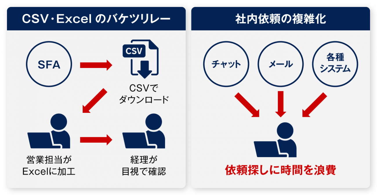 システムが部門ごとにサイロ化していると、その隙間を埋めるために現場の非効率的な業務が生じてしまいます。よくある問題が、「CSVとExcelのバケツリレー」です。営業担当者がSFA(Sales Force Automation:営業支援システム)からデータをダウンロードし、経理用にExcelで加工します。それを経理担当者が目視で確認し、システムへ手入力するのです。この作業によって、数名が月末に拘束されることになります。