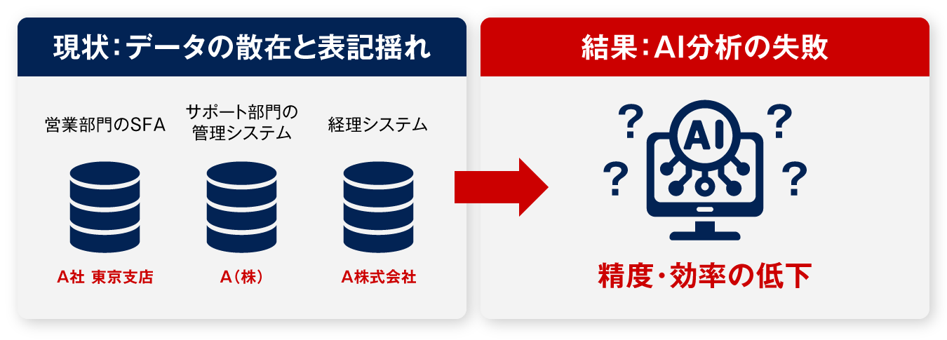 「AIを活用して優良顧客の分析をしたい」と考えても、顧客マスタデータが営業部門のSFA、サポート部門の管理システム、経理システムなどで分散管理されている場合、分析の精度や効率は大幅に低下します。社名が全角/半角、支店名が部署名に含まれている/いないといった表記揺れが存在すれば、名寄せ(同一顧客の突合)すら困難です。このような不整合なデータをもとに得られるのは、無意味な分析結果に過ぎません。