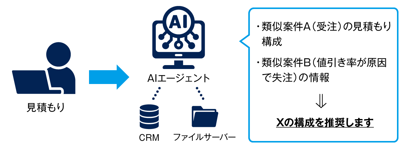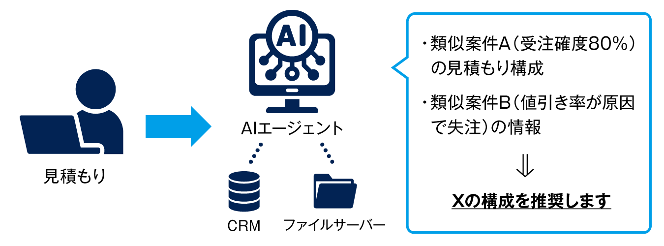 営業担当者による見積もり作成を例に挙げると、AIエージェントがCRMや過去の受注データを横断的に検索し、「今回の案件と類似する過去のA案件(受注)の見積もり構成と、B案件(失注、値引き率が原因)の情報を提示します。推奨する構成はXです」といった具体的な提案を行うことが可能になります。