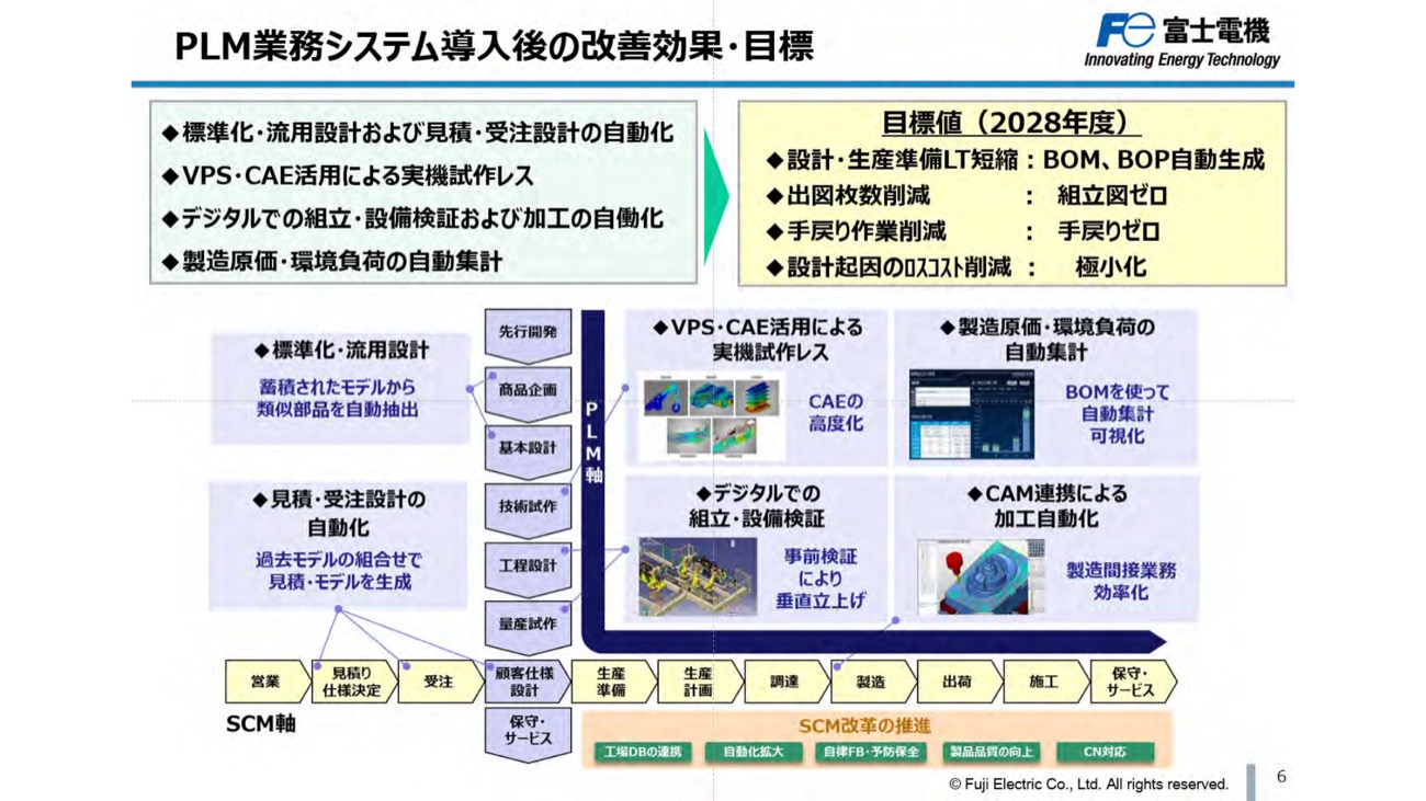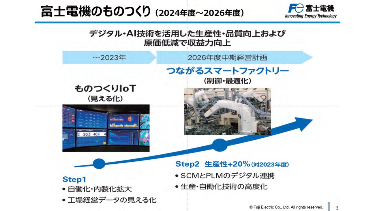 エネルギー機器からパワー半導体、自販機まで多岐にわたる製品を手掛ける富士電機。2026年度の中期経営計画で生産性20〜40%向上を掲げる同社が取り組むのは、設計情報と生産情報のデジタル連携だ。