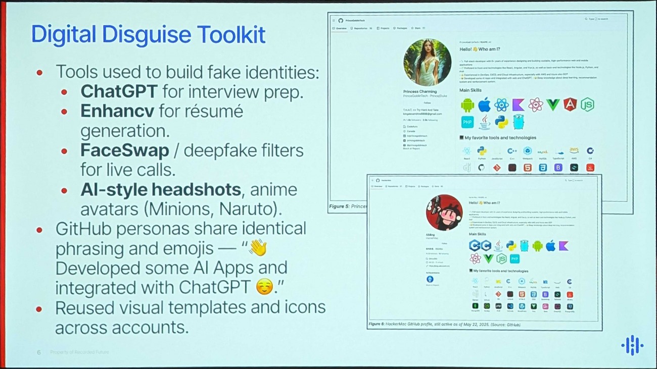 最近では、米国の兵士が自身の身分情報を売ってしまい、それが北朝鮮側に悪用されたことで起訴されるといった事例も発生している。こうして得た実在の人物のID(社会保障番号、運転免許証など)をもとに、LinkedInやGitHubのプロフィールを精巧に作り上げていく。