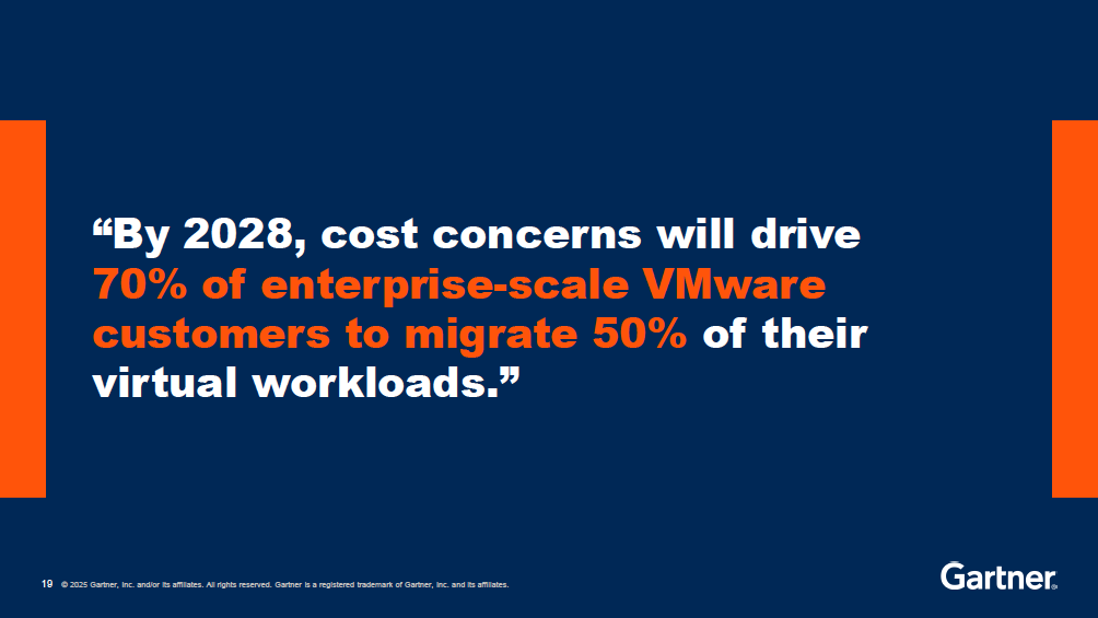 VMwareインフラの移行に関するガートナーの予測:2028年までにエンタープライズグレードのVMware顧客の70%が彼らの仮想化ワークロードの50%を(VMwareから)移行。エンタープライズグレードのワークロードの35%が移行