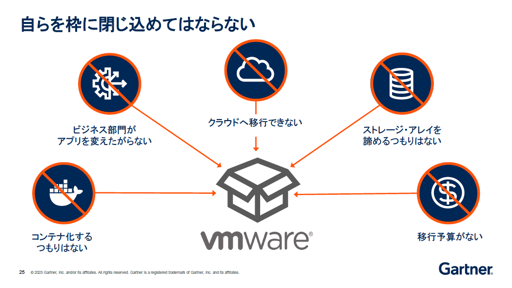 たとえば、ビジネス部門がアプリを変えたがらない、ワークロードの性質上、クラウドに移行することはできない、移行予算がない、既存のストレージアレイを無駄にしたくない、コンテナ化するつもりはない、移行予算がないなど…...。そうした事態に遭遇するとつい“できない理由”に逃げたくなるが、どんな場面でも選択肢はひとつではない。もちろん、検討を重ねた結果、VMwareのままで行く(Stay VMware)という選択をしても構わない。大事なのはユーザー企業が自ら決断をするということだ。様々な選択肢があることを心に留め、最終的には自分の決断に従ってプロジェクトを前に進めてほしい」