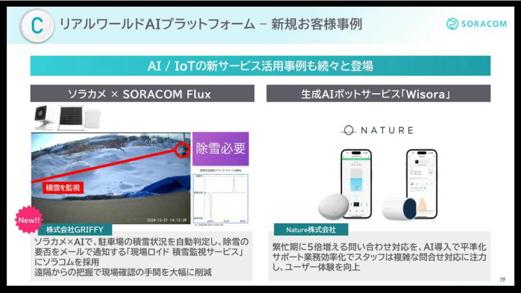 これを具現化しているのが、クラウドカメラサービス「ソラカメ」や生成AI基盤を活用した事例だ。たとえば、北海道のコープさっぽろでは、ソラカメで撮影した画像を生成AIで解析し、売り場の在庫状況の自動測定や、倉庫への不正侵入検知を行っている。また、建設業向けのDXソリューションを提供するGRIFFYでは、駐車場の積雪状況をAIで自動判定し、除雪の要否を通知するシステムの構築をソラコムの技術を活用して実現している。