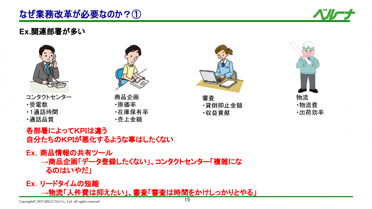 業務改革の案件にするかの判断基準を設定しているのは「自分たちの部署のKPIに関係ないことはやりたくない」、あるいは「悪くなることに協力したくない」という心理が働くためだ。それに、IT部門には「Amazonと同じシステムを作ってほしい」など、具体性の低い要望が来ることもある。商品情報を共有できる仕組みを導入する場合、最初は全部署が賛成するが、データ登録の負担が発生するとわかると、売上金額や受電数をKPIに持つ部署が反発してしまう。