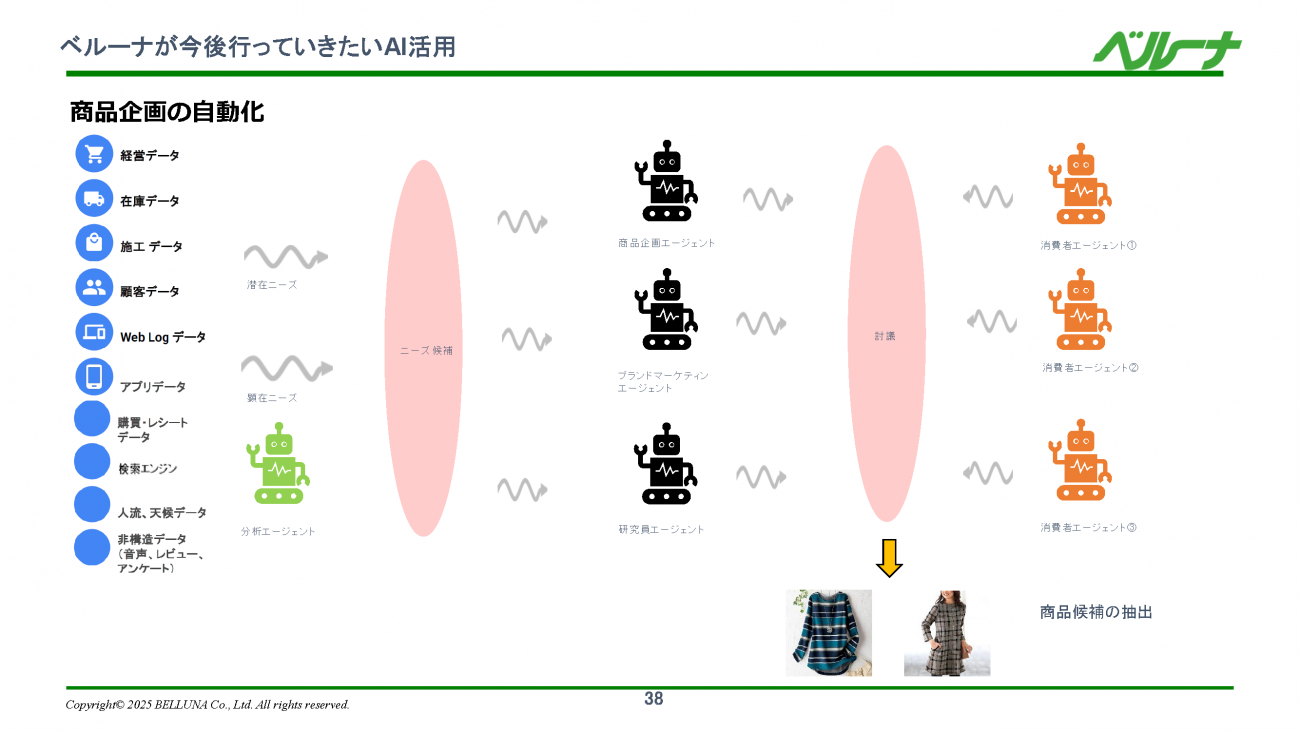 さらに、商品企画でのAI活用も視野に入れる。顧客理解を拡張し、潜在ニーズや顕在ニーズを発見できないか。浅沼氏は「専門エージェントを使い、商品案を出してもらうことをやってみたい。また、消費者エージェントを使い、出てきた案を競争させる。最適化に挑戦することにも取り組んでいきたい」と語る。人手不足の悩みを解決したい思いは強いが、それでも「私たちがどうしたいかではなく、お客様がどうしてほしいか。お客様主体を徹底したい」と、浅沼氏はベルーナのAI戦略の方向性を訴えた。