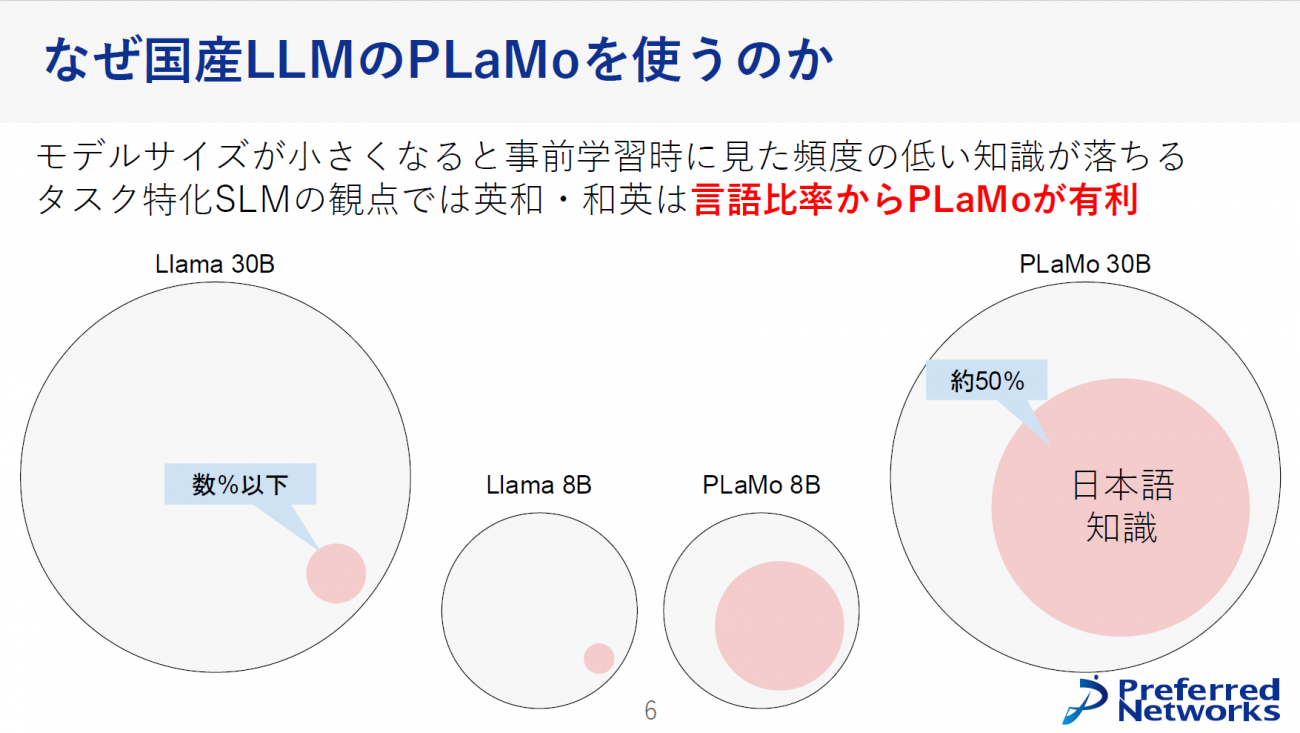 PLaMo翻訳は、ブラウザベースの翻訳特化型LLMです。構造としては、弊社が開発した国産LLM上に翻訳モデルを作っているんですが、その経緯について簡単に説明すると、海外産のLLMは日本語の割合が非常に少ないんですよね。日本語のデータは全体のデータの数%以下ですが、弊社のモデルだと約半分が日本語のデータです。加えて、特定のタスクに特化したSLMに関しては、モデルサイズが小さくなると事前学習時にデータが入っていない領域の知識は質が落ちてしまいます。そのため、日本語の知識を有効活用するうえでは、弊社のモデルをはじめとした国産のLLMが有利だと思っています。