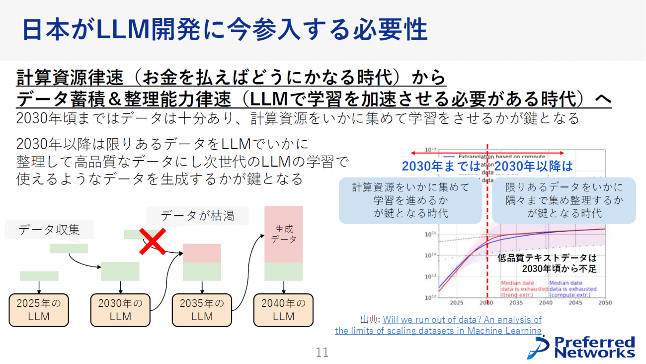 また、国産LLMの開発には“今”参入すべきだと考えています。というのも、今はデータを集めればその分計算資源が集まるといった状況ですが、それを継続的に繰り返さなければ、何年後かにはデータが枯渇し他国と比べて大きな後れをとることになるでしょう。そのため、今から継続的にデータを集め続けるべきだと考えています。