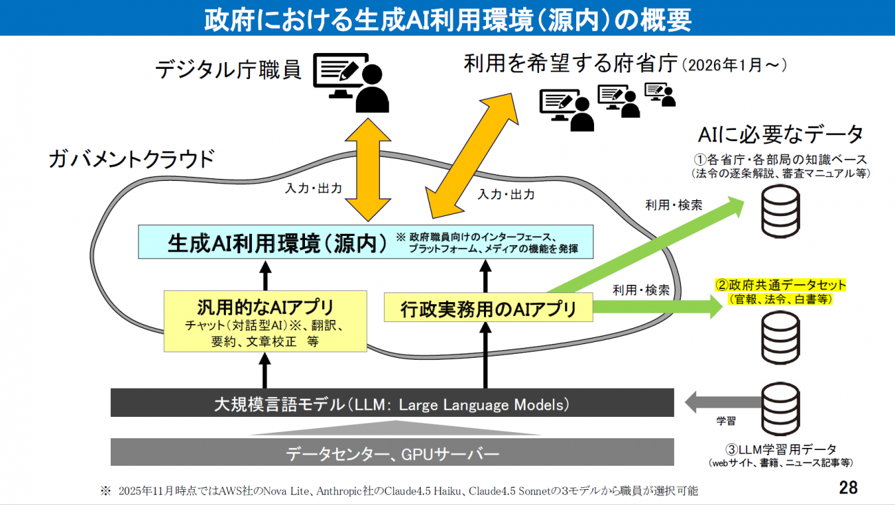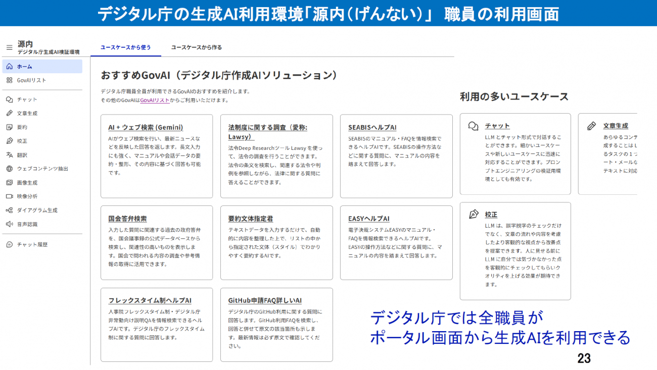 その後、デジタル庁では政府内のAI活用における使い勝手を良くするべく、2025年から先ほども紹介に預かった「源内」という内製モデルに切り替えました。源内は、職員が自発的にオープンソースのGUIなどでモデルを拡張したことをきっかけに、2025年頃から構築が始まっていったものです。