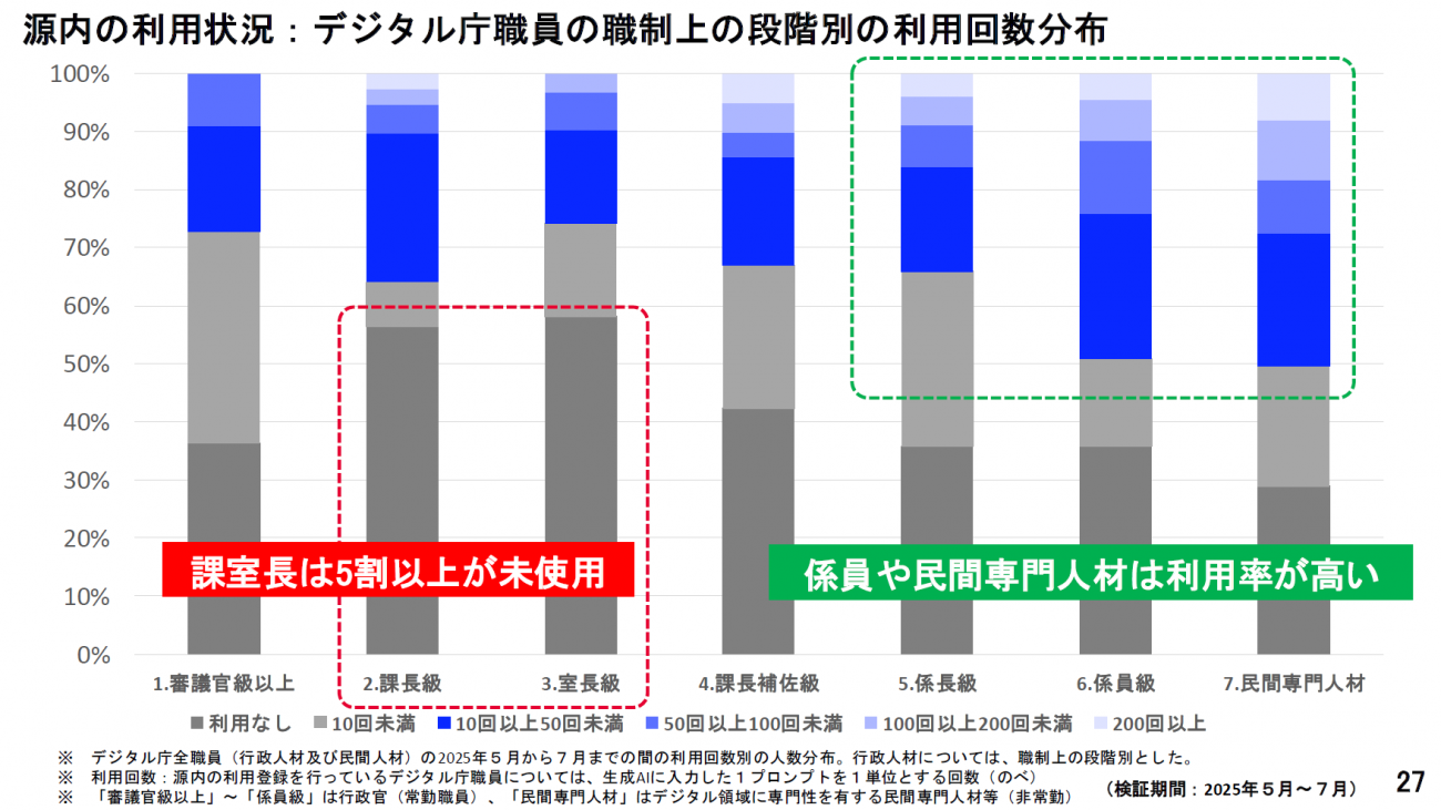 現在、デジタル庁内ではダッシュボードで日々の利用状況をモニタリングをしているのですが、職員の過半数である1,247人が利用しています。細かな属性を見ると、現場に近い係員などは利用率が高いのですが、課長、室長、企画官などは利用率が低いです。幹部クラスの人たちにAIをいかに使ってもらうかが、課題のひとつになっています。