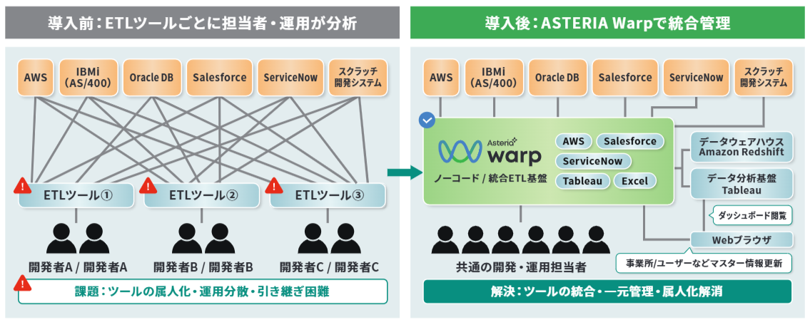 また、既存のIBM i(AS/400)、AWS、Tableauといった業務システムに加え、新規導入されたSalesforce、ServiceNowとの連携にも柔軟に対応。分散していた3種類のETLツールをWarpに一本化し、約300のデータ連携フローが数秒~数分間隔で自動実行される基盤を構築したとのことだ。その結果、IT部門の負担の軽減と安定稼働の両立を達成していると述べている。