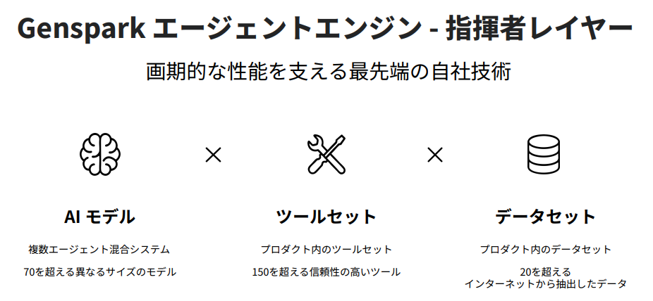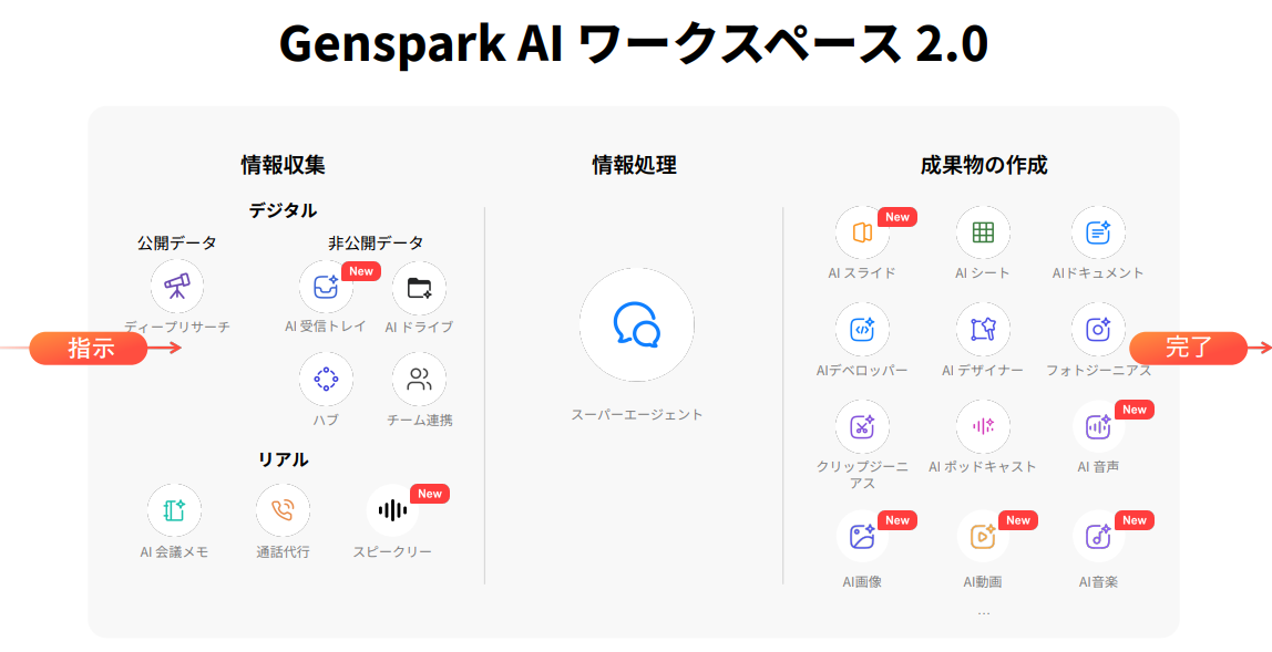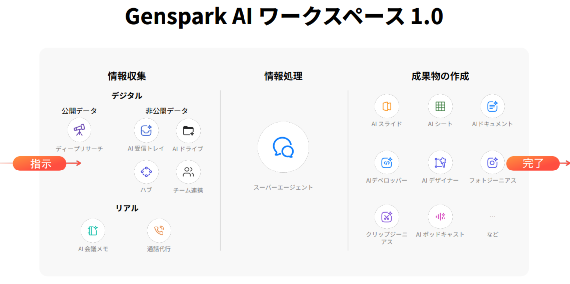 仕事には大きく分けて①情報収集、②情報処理、③アウトプットの3つのプロセスが存在し、Gensparkはこれらすべてを自律代行するとのことだ。