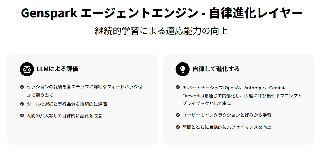 CTOであるカイ・ジュ―(Kai Zhu)氏からは、同プラットフォームのAIモデルについて説明があった。Gensparkでは70以上のモデルを使い分けており、「どのタスクにどのモデルが最適か」をAIが判断・実行する。また、20以上のソースからデータを抽出し、AIのハルシネーションを抑制する設計になっているとのことだ。加えて、ユーザーからのフィードバックを学習に取り入れ、実行品質の向上も行っているとジュ―氏は紹介。「たとえGensparkのスタッフが長い休暇をとっていたとしても、AIモデルが自律的に学習・改善を行い、自動的にパフォーマンスの向上を実現する」と説明した。