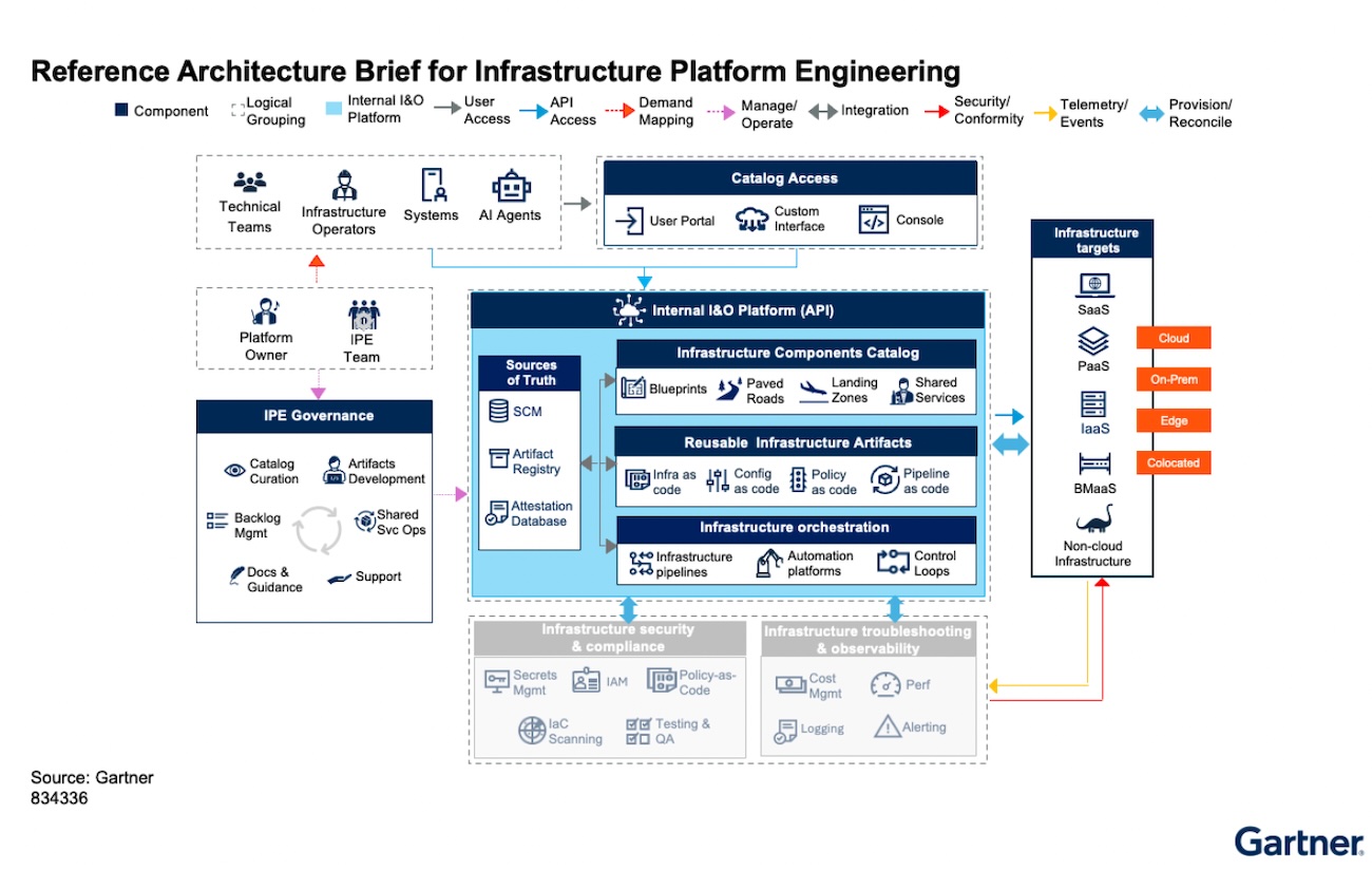 ガートナーのアナリストの青山浩子氏は、「IaCの考え方は、クラウドの登場以前に提唱された『サーバーライフサイクル自動化』に近いが、より洗練されたものとして進化したもの」とし、「何よりも、デリバリーの迅速化とテストの自動化を実現するアプローチであることを理解するべき」と強調した。また、ガートナーではIaCを、「Infrastructure Platform Engineering(以降、プラットフォームエンジニアリング)」の構成要素の1つ「Reusable Infrastructure Artifacts(再利用可能なインフラアーティファクト)」の一部と位置付けている。ここでのアーティファクトとは、インフラ全体をプロダクトとみなし、セルフサービス体験を通して自動化を進めるためのアプローチの総称で、IaC以外のアプローチも含まれる。