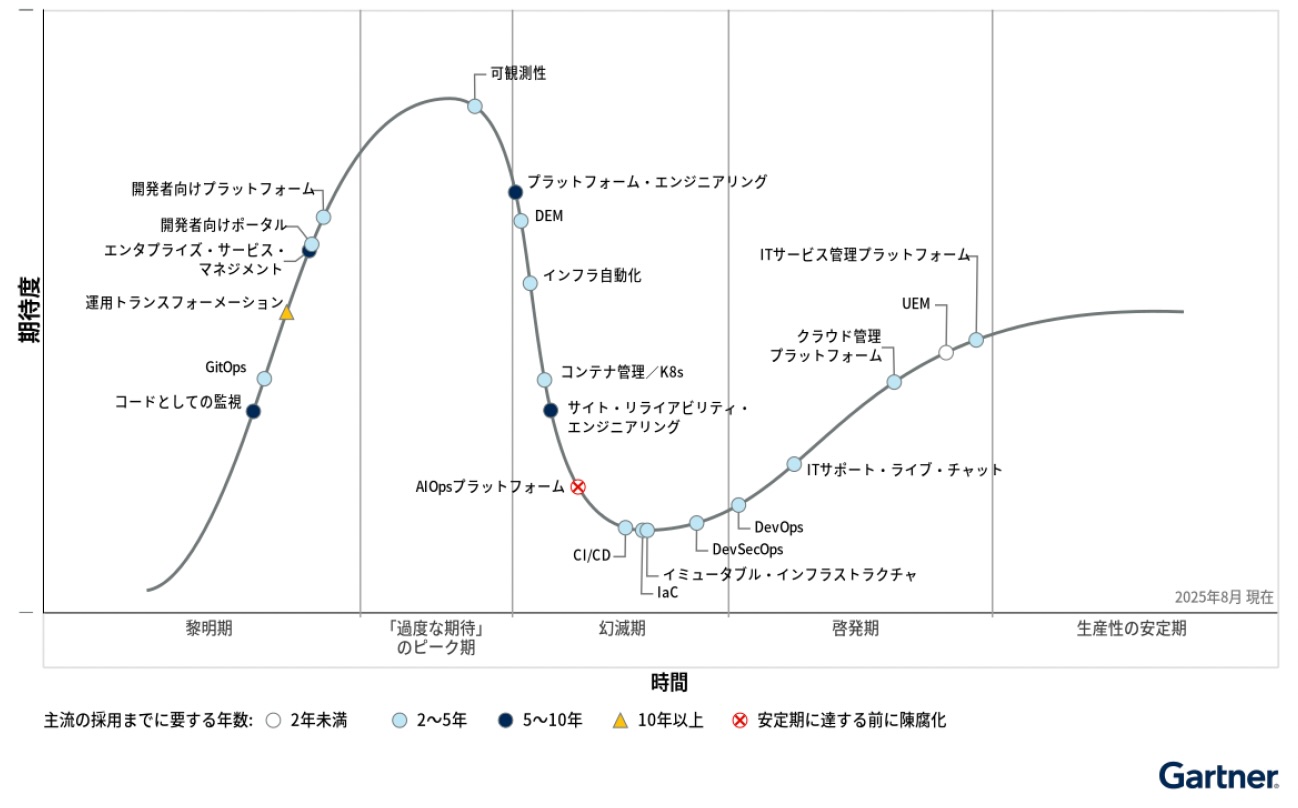 しかし、国内市場全体では、このような企業ばかりではない現状がある。「日本におけるITオペレーションのハイプサイクル:2025年」を見ると、IaCは幻滅期に位置しており、啓発期にある海外のハイプサイクルと比べると事情は大きく異なる。国内外の温度差、そして国内でも「IaCは当然」と考えている企業と「IaCとは何か?」と考えている企業に二分される現状に至った要因は大きく2つあると青山氏は指摘する。