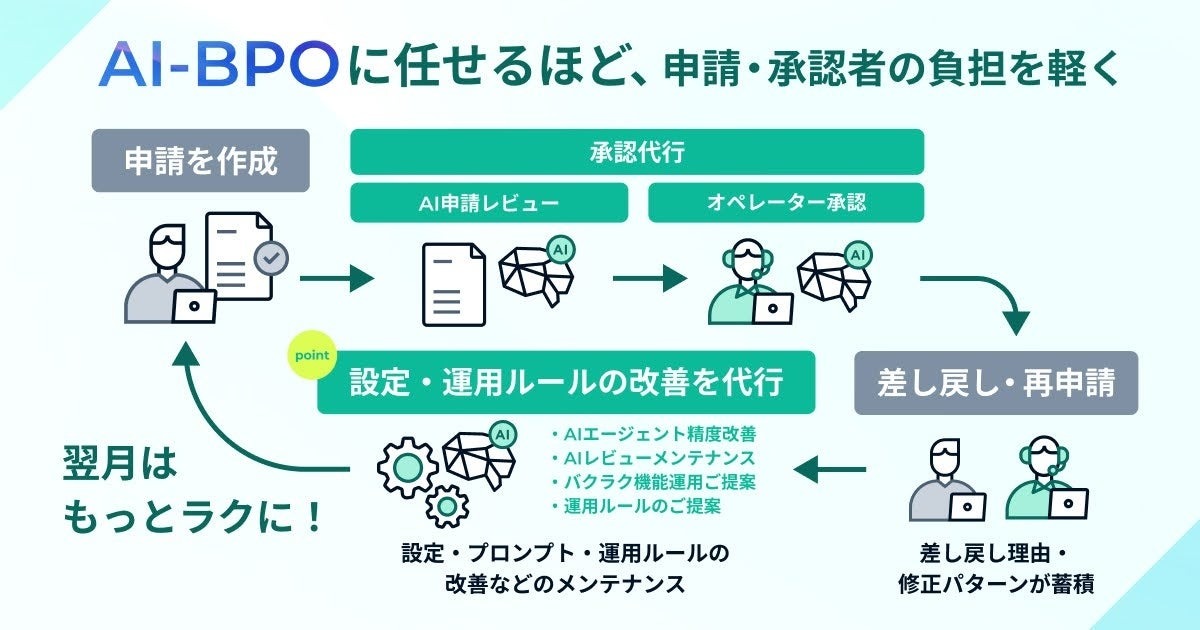 バクラク承認代行は、領収書の入力値や社内規程に即した承認状況の確認をAIと専門オペレーターが協働して代行する「AI-BPO」を採用したもの。単純な転記ミスや添付漏れのチェックから、企業固有の規程に基づいた費用の妥当性確認まで対応し、承認・差し戻し業務をワンストップで完結できるとする。