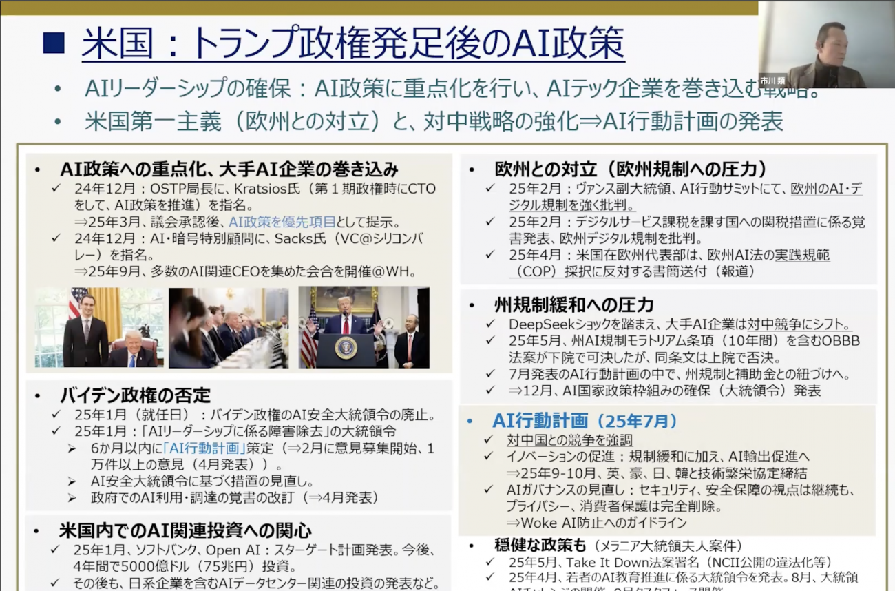 「同盟国への輸出まで踏み込んだのは、大きなポイントです。一方で、DeepSeekショックが米国の政策動向に大きく影響しました。米ビッグテック企業は、政府に対して国内の規制緩和を強く求めるようになったのです」(市川氏)