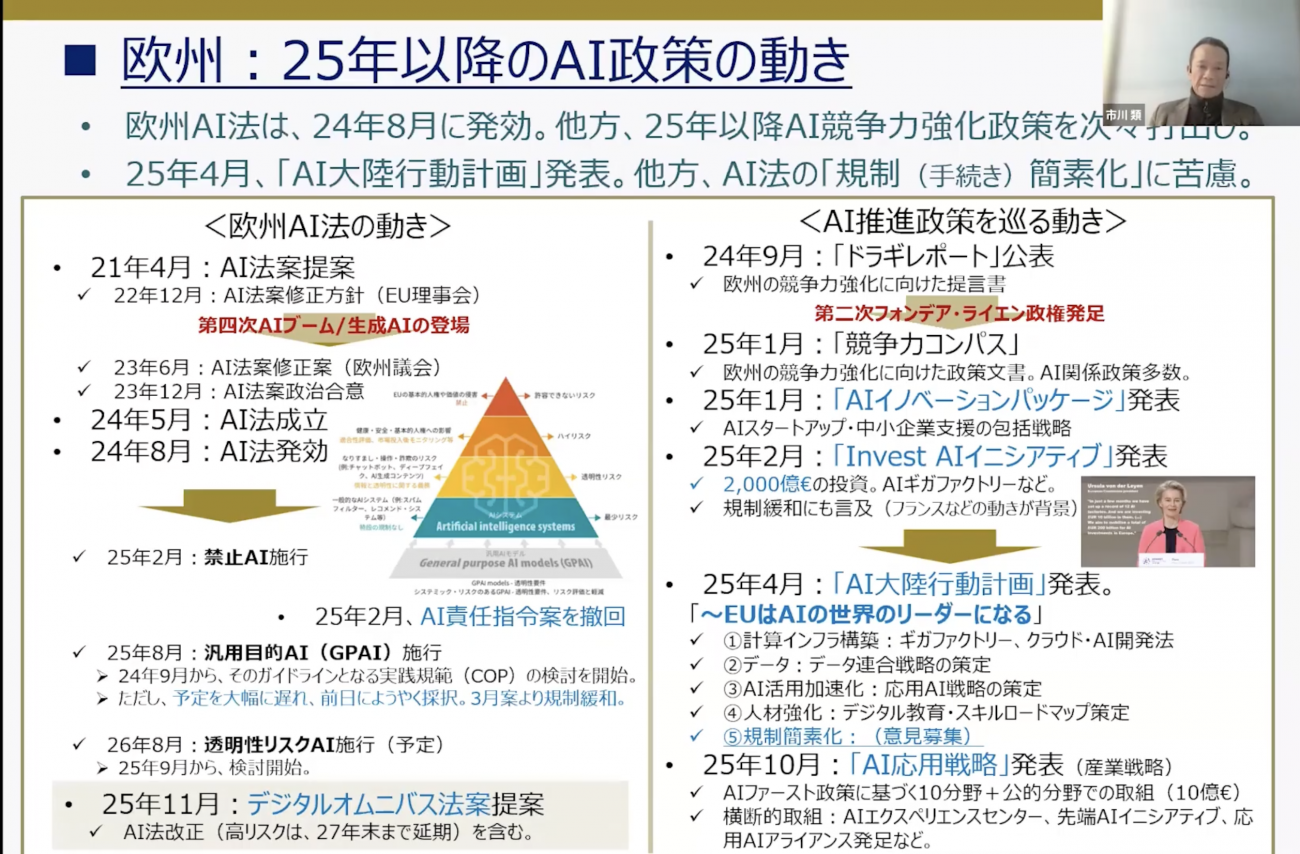 さらに、2025年4月には「AI大陸行動計画」を発表する。「この計画のポイントは、『EUはAIの世界的なリーダーになる』と明確に打ち出したことだ」と市川氏。同計画では、「計算インフラ構築」「データ連合戦略の策定」「AI活用の加速」「人材強化」を進めていくとした。