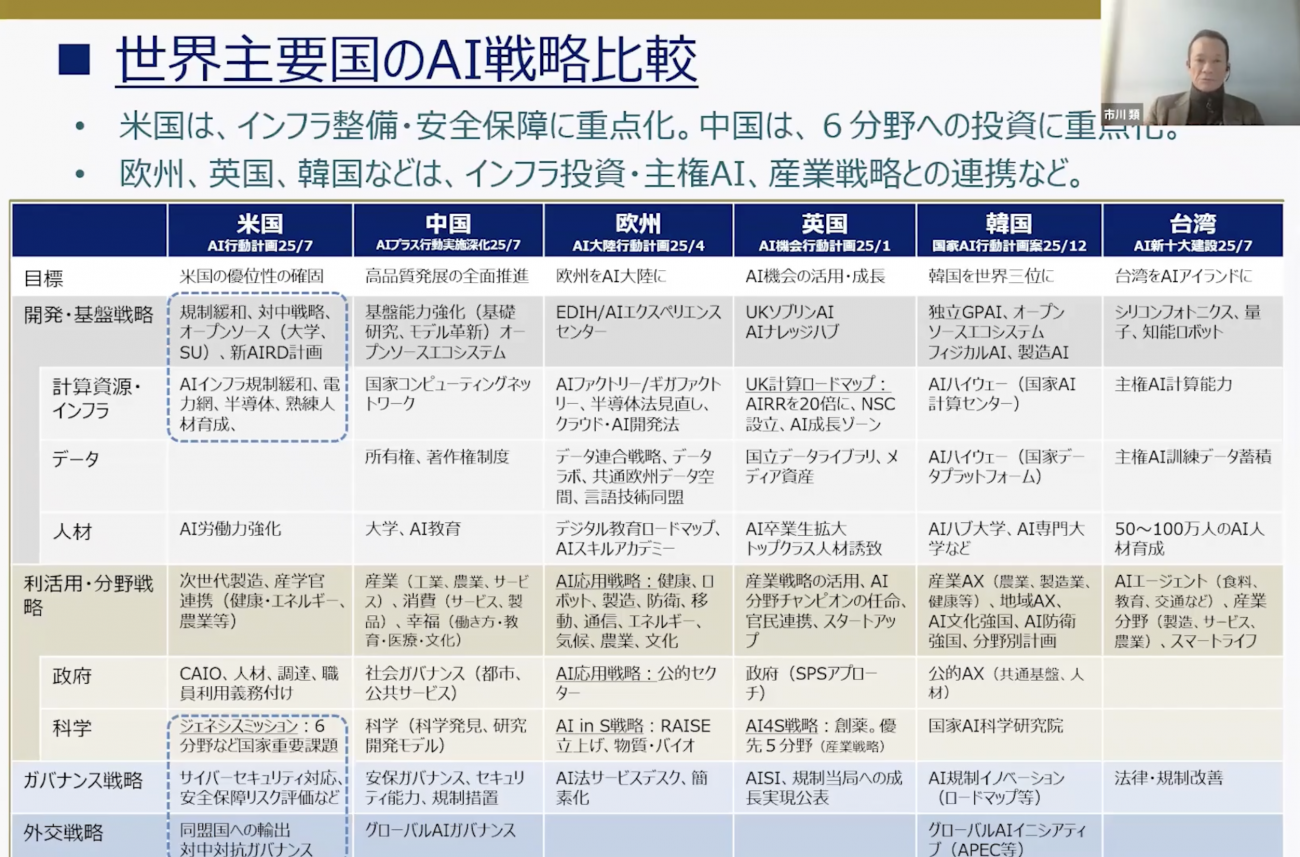 法制度の動向とは別に、市川氏は各国のAI戦略の動向も解説した。2025年には、米国の「AI行動計画」からEUの「AI大陸行動計画」、中国の「AI+」のほか、韓国、フランス、英国、豪州、カナダ、台湾、および日本の「人工知能基本計画」まで、主要国はすべてAI戦略を更新している。現在リードしているのは米中で、英仏韓の3国が3位争いを繰り広げているとのことだ。