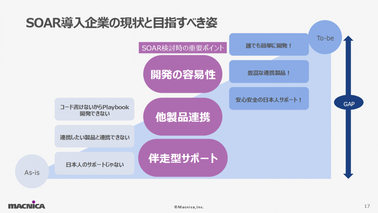 これらを読み解くと、「開発の容易性」「他製品連携」「伴走型のサポート」の3つが押さえるべきポイントだと同氏は述べる。SOAR導入企業の現状と目指すべき姿の間には明確なギャップが存在し、そのギャップを埋めるには製品の機能だけでなく、サポート体制を含めた総合的なアプローチが必要だ。
