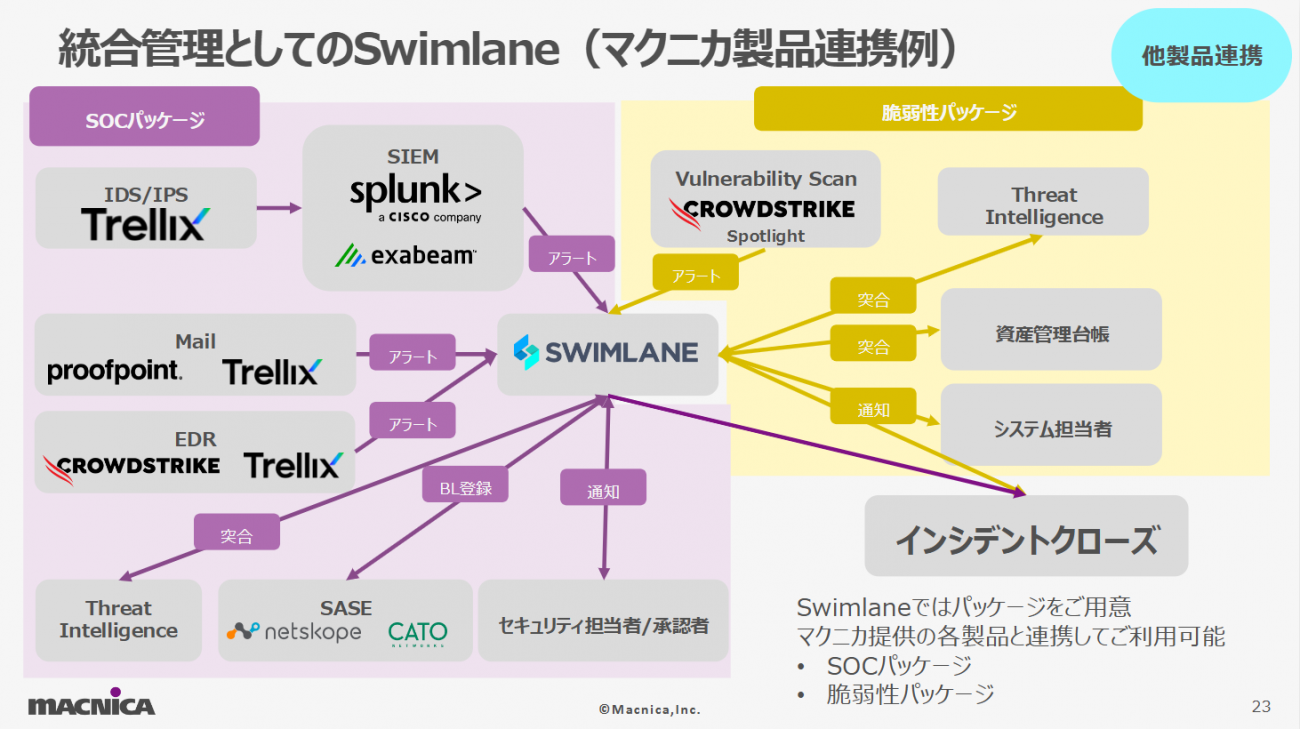 Swimlaneを中心としたセキュリティ統合管理の構成例。SIEM、EDR、メールセキュリティ、脅威インテリジェンス、SASEなど多様な製品と連携し、アラート取得から対処、インシデントクローズまでの一連のワークフローを自動化する