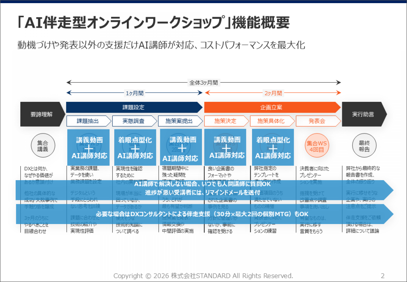 STANDARDでは今後、オンラインワークショップで作成された企画書や、AIとの対話ログといったデータを蓄積し、企業の「DX資産」として活用できる機能の強化も視野に入れている。どの部署でどのような課題があり、誰がどのような解決策を考えているのか。これらの情報が可視化されれば、組織全体のDX戦略をより精緻に描くことができるようになる。