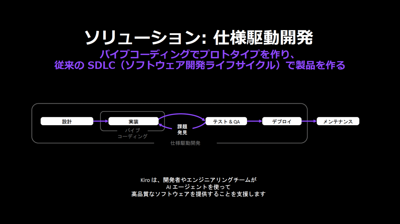 KiroがAmazon/AWSの標準開発環境に指定された背景には、自社でAI駆動開発を進めてきた中で得た知見と経験がある。瀧澤氏は、「12月に開催されたAWS re:Invent 2025で、ワーナー・ヴォゲルス(Amazon.com CTO)が説明していた開発の経緯が興味深かった」と述べる。そこでは1つ目に、バイブコーディングの限界が見えてきたことが挙げられた。エンジニアが満足できる品質のコードを得るためには、AIとのラリーを何度も繰り返さなくてはならない。