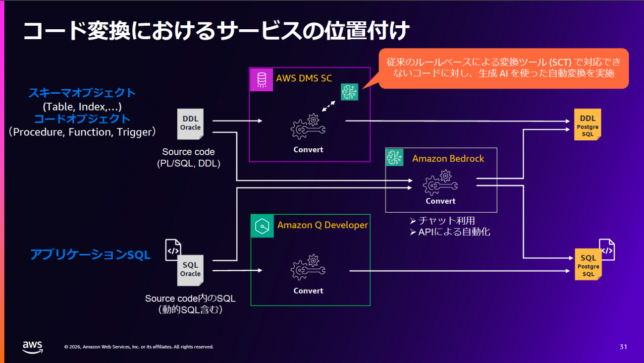 なお、スキーマ変換に限らず、変換ツールを使っても100%のオブジェクト自動変換ができるわけではない。特に、Oracle Databaseで構築したシステムにおいて、複雑なビジネスロジックを含むPL/SQLで書かれたストアドプロシージャー、ファンクション、パッケージなどは、固有の機能や構文が多用されており、DMS SCを利用しても、完全な自動変換が困難な場合がある。自動変換ができなかったコードについては、生成AIを利用した自動変換で負担を軽減できるようになった。