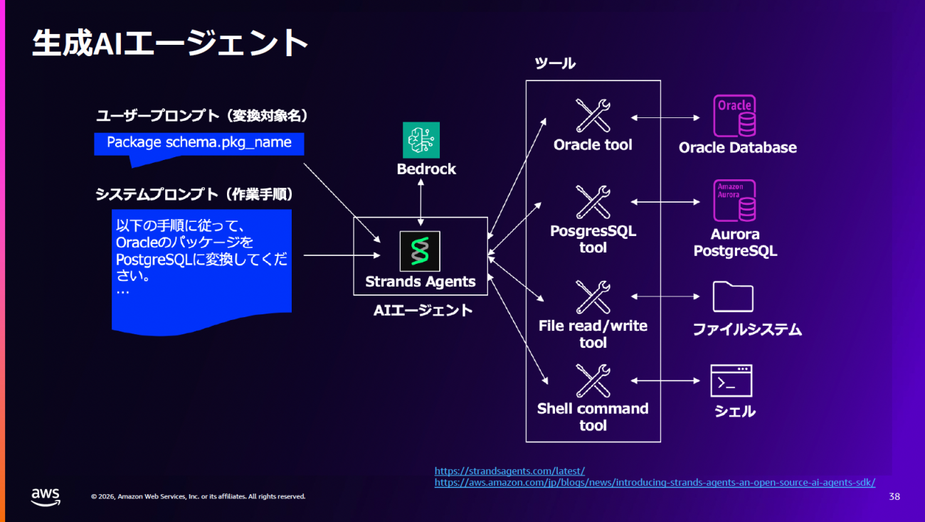 この事例の特徴は、「人間はプロンプトでの指示のみを担当し、それ以外はAIエージェントがツールを操作し、移行を進めたこと」だと瀧澤氏は話す。図4の中央にある「Strands Agents」は、AWS が開発したPythonベースのオープンソースSDKだ。二重らせんのロゴが示すように、「モデル」と「ツール」という2つの要素を組み合わせ、精度とコードを改善する、AIエージェント構築と実装のためのフレームワークとしての役割を果たす。