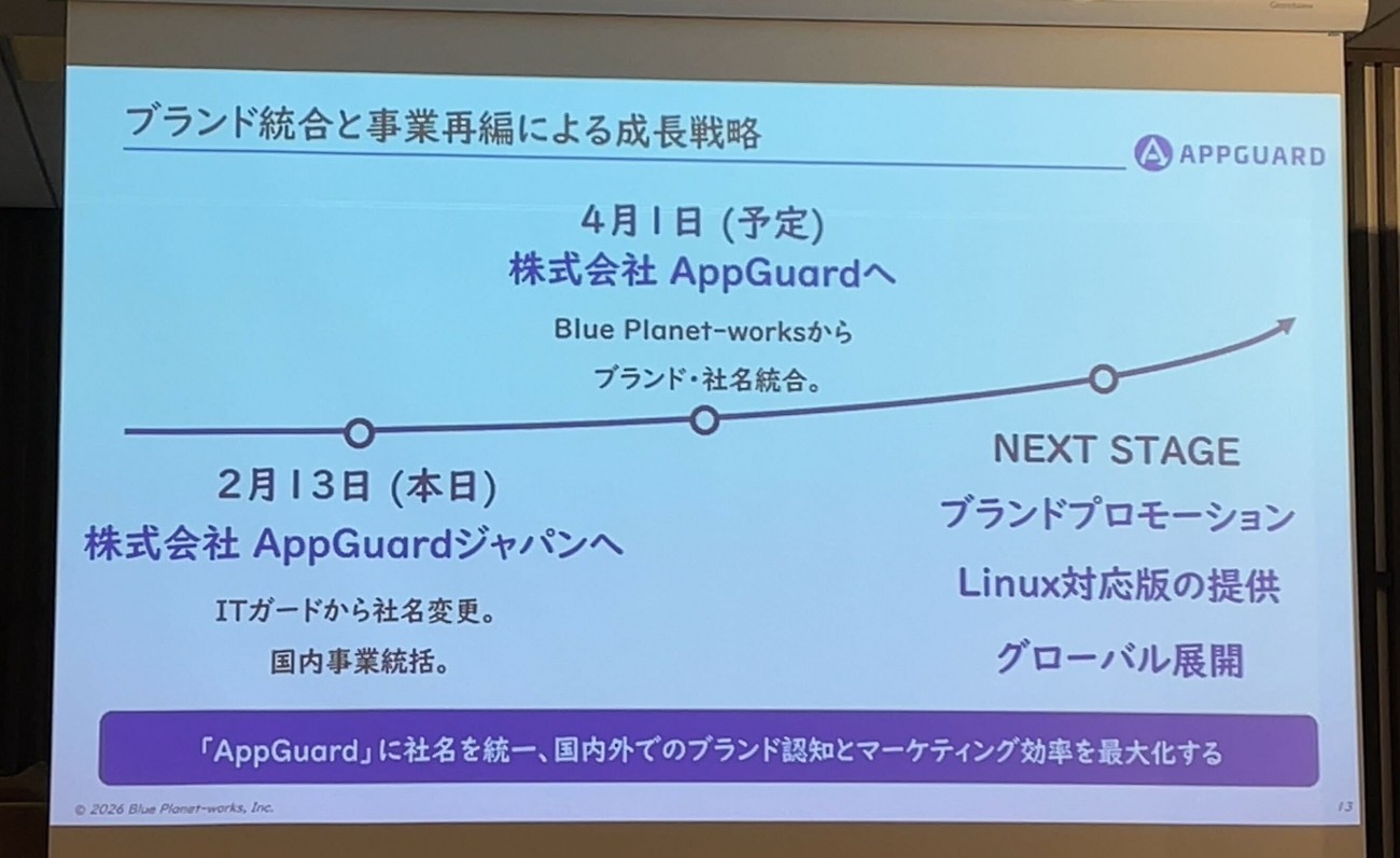 Blue Planet-worksは、2026年4月1日付で社名を「AppGuard(アップガード)」へ変更することを発表した。なお、国内事業を統括するITガードは、2月13日付で「AppGuardジャパン」へと社名変更したとのことだ。