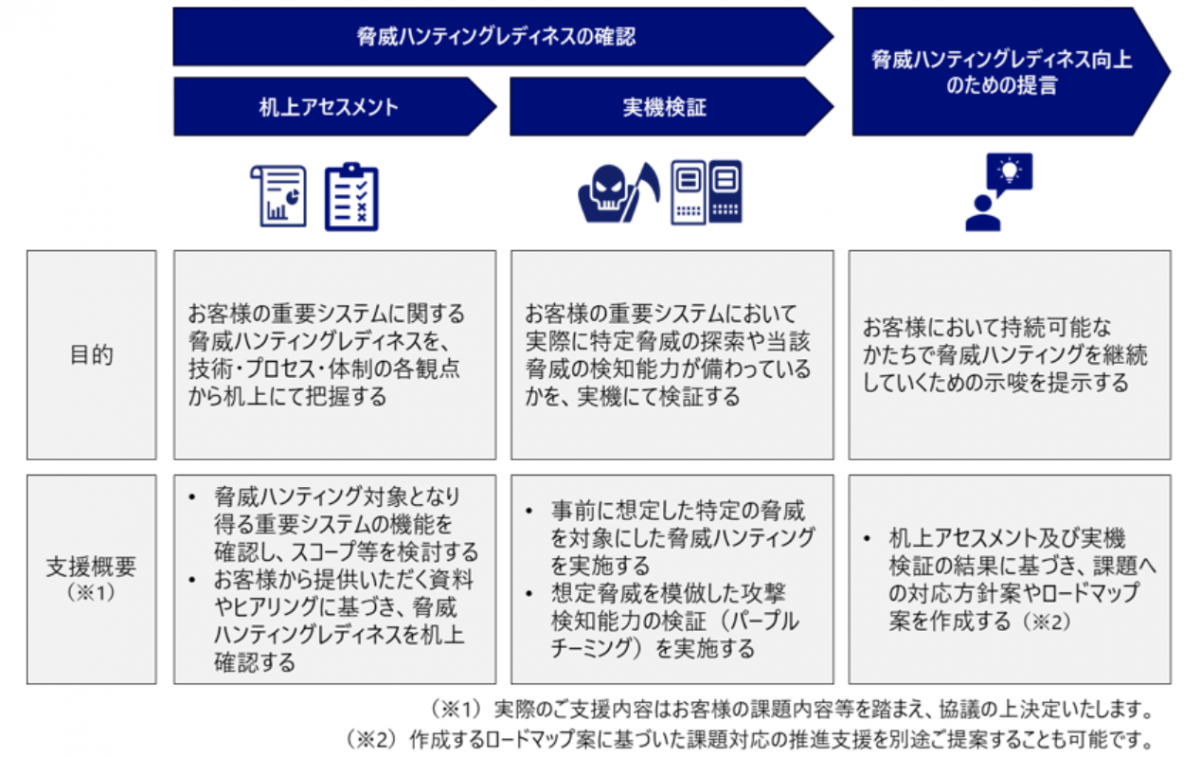 同サービスでは、机上アセスメントと実機検証を通じて、脅威ハンティングレディネスの構築を支援。まず、技術・プロセス・体制の各観点から、脅威ハンティングを実施するための準備状況(レディネス)を机上で確認するという。その後、顧客側の実機で特定の脅威を想定した脅威ハンティングや、想定脅威を模倣した攻撃に対する検知能力の検証(パープルチーミング)を実施するとのことだ。これらの実施結果を踏まえ、脅威ハンティングレディネスを向上させるための提言を作成し報告するとしている。