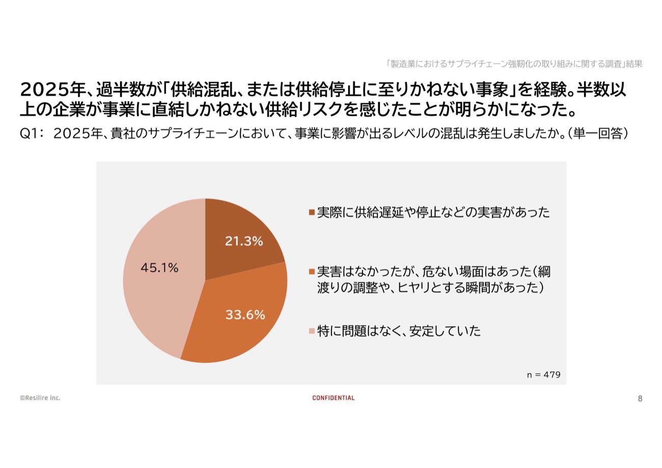 2025年、製造業の調達・購買部門の管理職約500名を対象に実施した調査では、サプライチェーンの供給混乱、または供給停止になりかねない事象を経験したと答えた企業が過半数に上った。この調査を実施したResilire(レジリア)の事業開発部長の永峰康司氏は、混乱時に最も苦労した点として「リスク情報の検知および影響範囲の特定」「サプライヤーとの連絡・連携」という初期対応フェーズに60%超の回答が集まったことを示した。問題が起きた後の対処能力よりも、「何が起きているのか・自社への影響はどの程度か」を即座に把握できないことが最大の痛点だったことになる。事前回避できなかった理由の上位3つも、「バックサプライヤーの把握不足」「リスク情報の早期検知ができなかった」「サプライチェーン構造の可視化ができておらず影響範囲を特定できなかった」と、いずれも平時の情報管理に関わる問題だった。