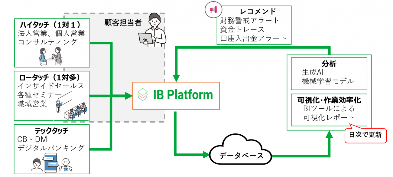 IBPlatformは、多様な顧客接点(ハイタッチ/ロータッチ/テックタッチ)から得られる情報をデータベースに蓄積しており、これにより以下の機能が実現しているとのことだ。