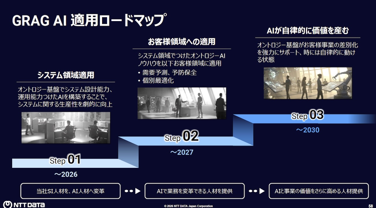 - STEP 1(〜2026年):システム領域の適用。GRAG AIで基本設計・詳細設計を、AI-Shoringで製造から総合試験を、運用巻取りで運用フェーズをカバーする。高度エンジニアリソースをSTEP 2領域へシフトさせることが狙いだ。