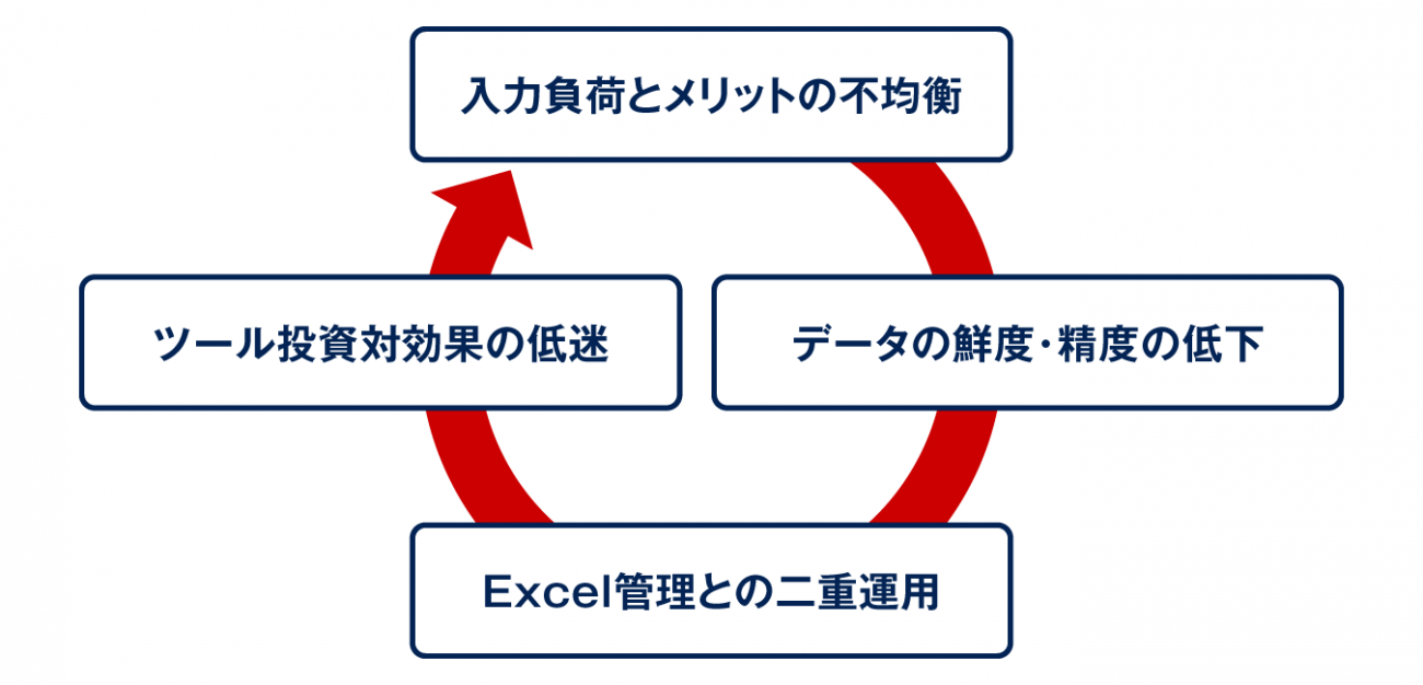 3. Excel管理との二重運用:マネージャーは正確な数字把握のためにExcelでの報告を求めざるを得ず、データが個人のPCに分散し、属人化してしまう