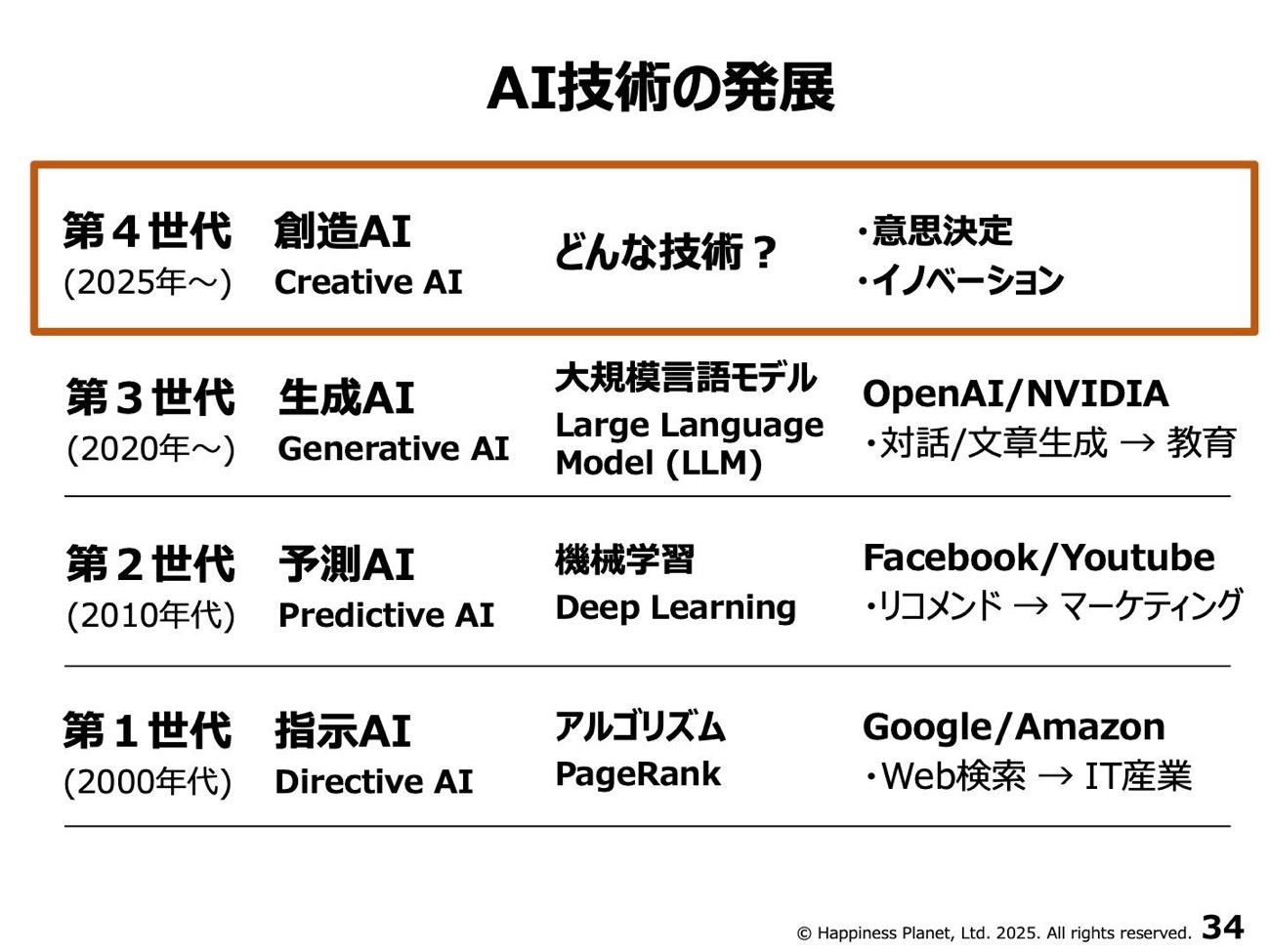 矢野氏はまず、現在のAI技術の系譜を4世代に分けて整理した。2000年代の「指示AI(Directive AI)」はGoogleの検索アルゴリズムに代表され、人間が設計したルールでウェブを整理した。2010年代の「予測AI(Predictive AI)」は機械学習とディープラーニングを武器に、FacebookやYouTubeのリコメンドエンジンを生み出した。そして2020年代の「生成AI(Generative AI)」は、大規模言語モデル(LLM:Large Language Model)を中心に、OpenAIのChatGPTやGoogleのGeminiへと結実する。