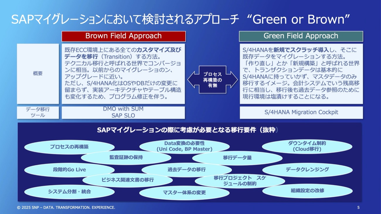 「グリーンフィールドで再構築したいが必要な過去データは持っていきたい」「ブラウンフィールドで移行したいが週末2日間でダウンタイムを終わらせたい」「複数拠点のSAPを統合しつつ部分的にプロセスも刷新したい」──いずれも、単純な二択では対応できない要件だという。