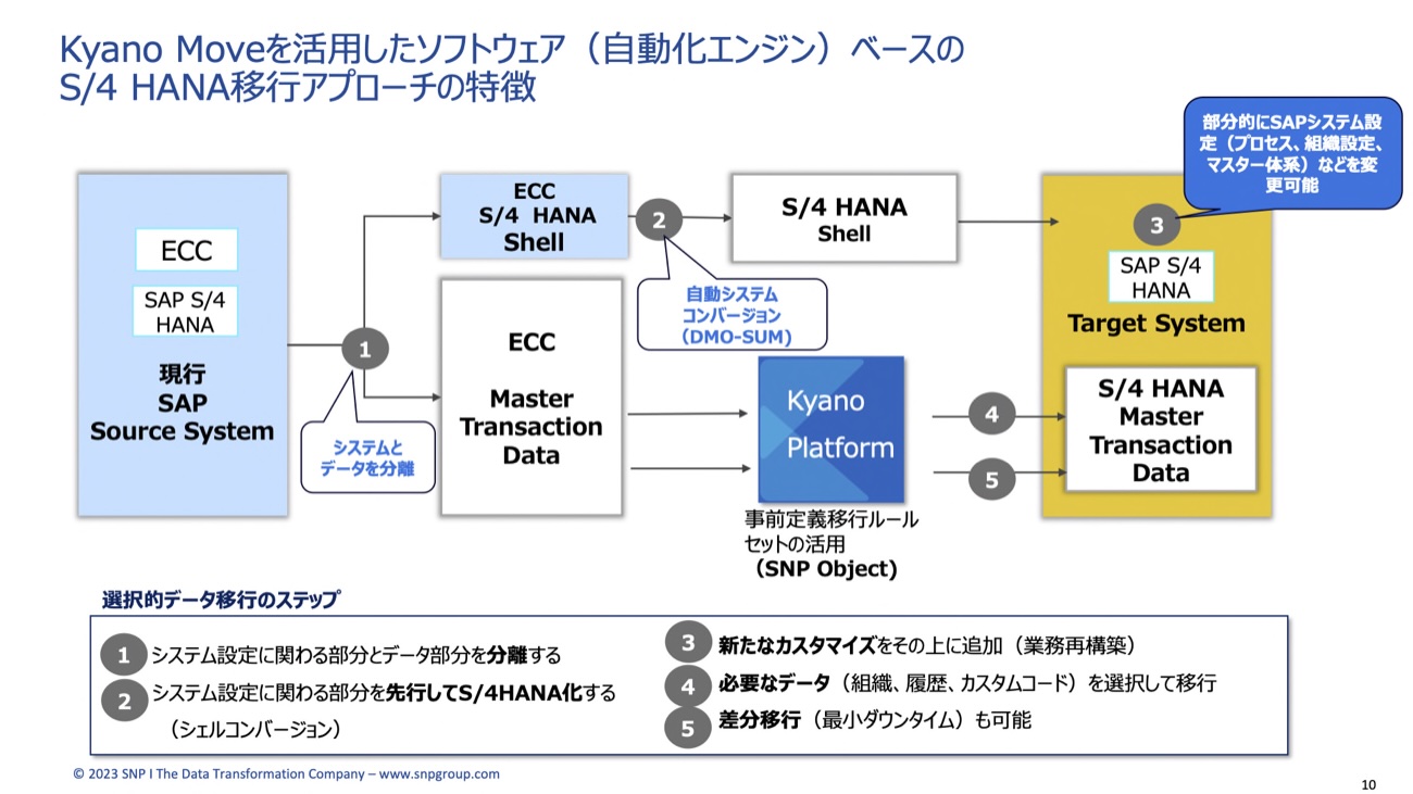 データの書き込みはSNPの「Kyanoプラットフォーム」という自動化エンジンが担い、ソースからターゲットへテーブル単位で直接書き込む。「SNPはSAPのテーブルを直接操作する許可を受けている企業の1社であり、パートナー企業にツールを開放している。だからこそ、日本の主要SIerがKyanoプラットフォームを使った独自の移行サービスを展開できる」と細谷氏は言う。「アクセンチュア、アビームコンサルティング、富士通、IBM、日立システムズ、電通総研、NTTデータグローバルソリューションズ、TIS、BeeXなど国内の主要SIerが採用しているのはその結果だ」と続ける。